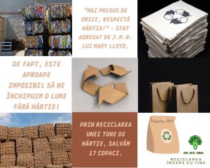 Aproximativ 35% din copacii tăiați pe întreaga planetă sunt folosiți pentru producerea de hârtie, de aceea, trebuie să ne gândim mai întâi cum să reducem consumul de produse, resurse, cum să le refolosim după ce nu mai avem nevoie de ele și abia apoi să le reciclăm – cei 3R.