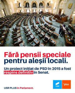 Fără pensii speciale! Astăzi, alături de colegii mei de la #USRPLUS am respins definitiv proiectul de lege inițiat de PSD prin care aceștia doreau sa fie introduse pensii speciale pentru primari, vice-primari, președinți și vice-președinți de Consilii Județene.